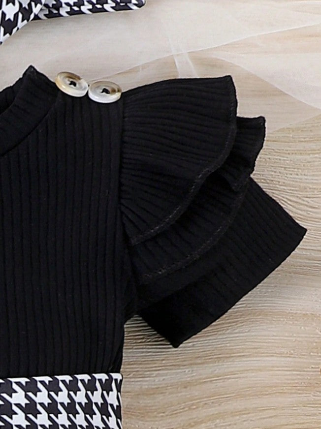 Dress your little fashionista in timeless style with this adorable 3-piece baby girl outfit set. Featuring a classic black ribbed top with flutter sleeves, a chic black and white houndstooth skirted bodysuit, matching bow headband, and knee-high socks with bows, this set is perfect for fall, winter, birthdays, or family photos. Designed for both infants and toddlers, this outfit combines cozy comfort with standout charm. Ideal for baby showers, first birthday outfits, or stylish everyday wear!
