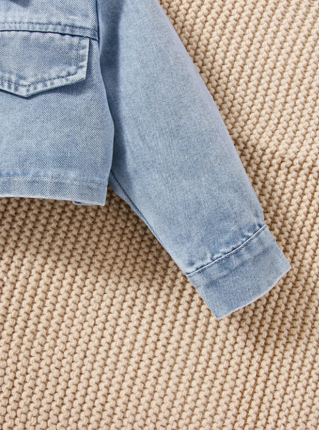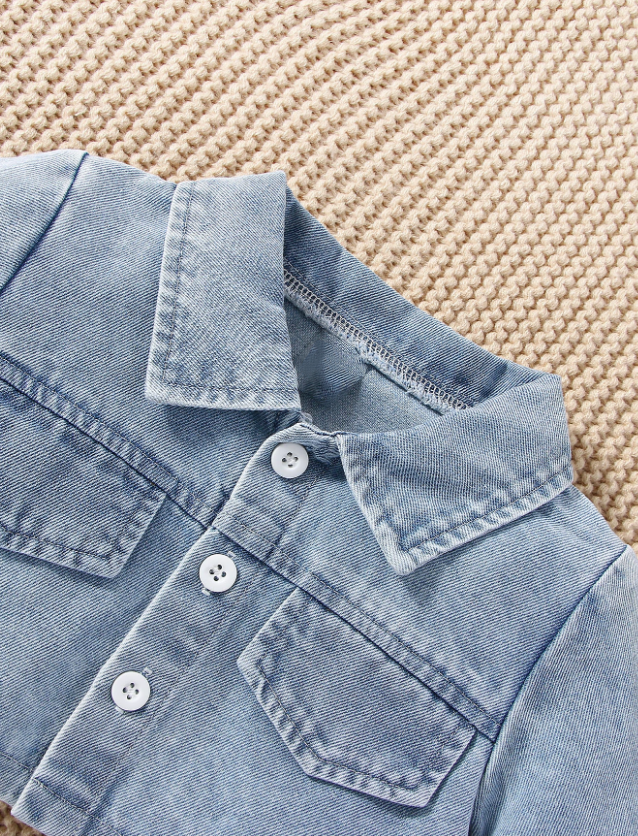 Layered on top is a classic light-wash denim jacket with a cropped cut and button details, giving the outfit a trendy touch while keeping your little one cozy on cooler days. Worn together or separately, this versatile set is perfect for playdates, parties, or casual outings.