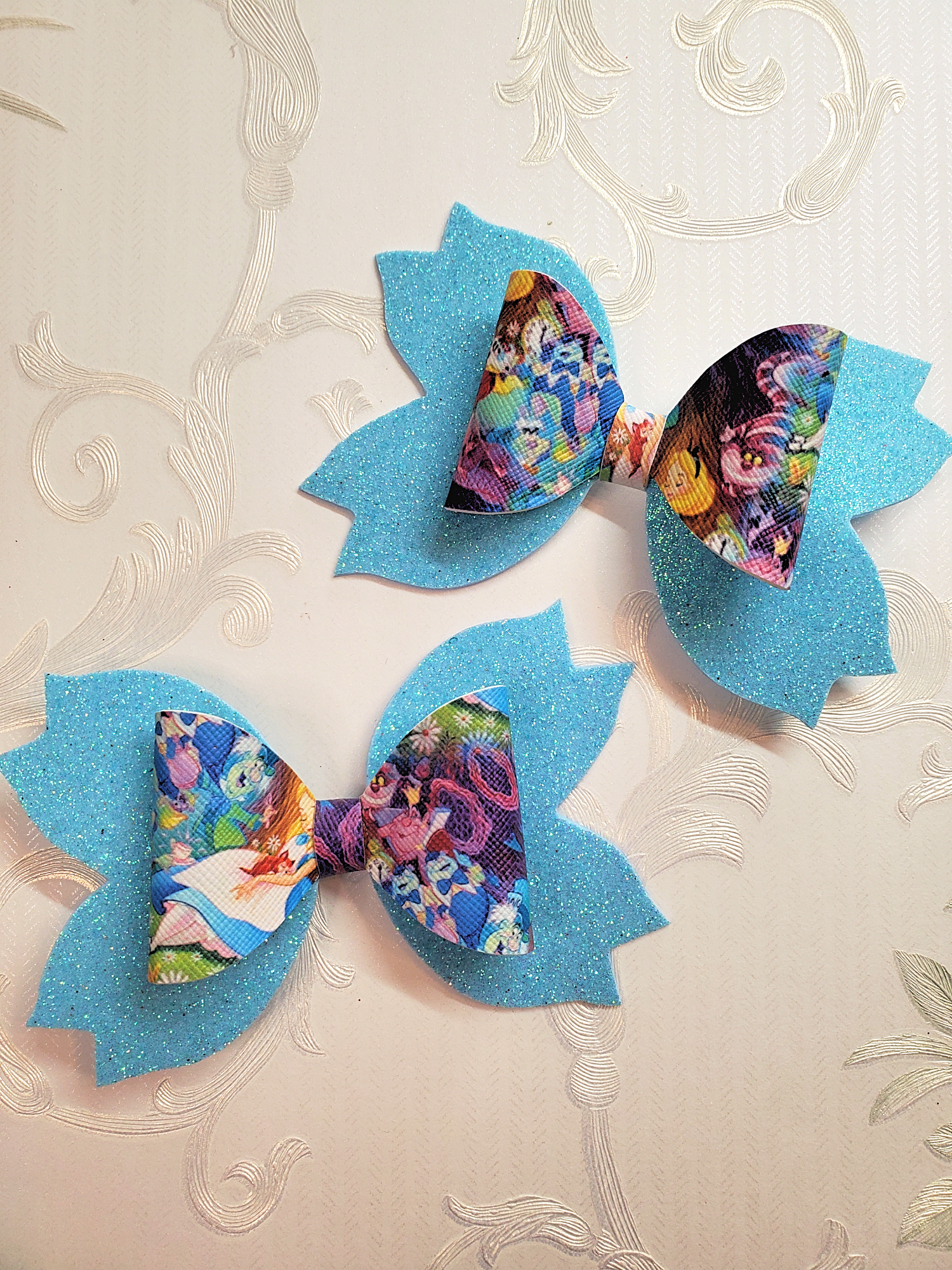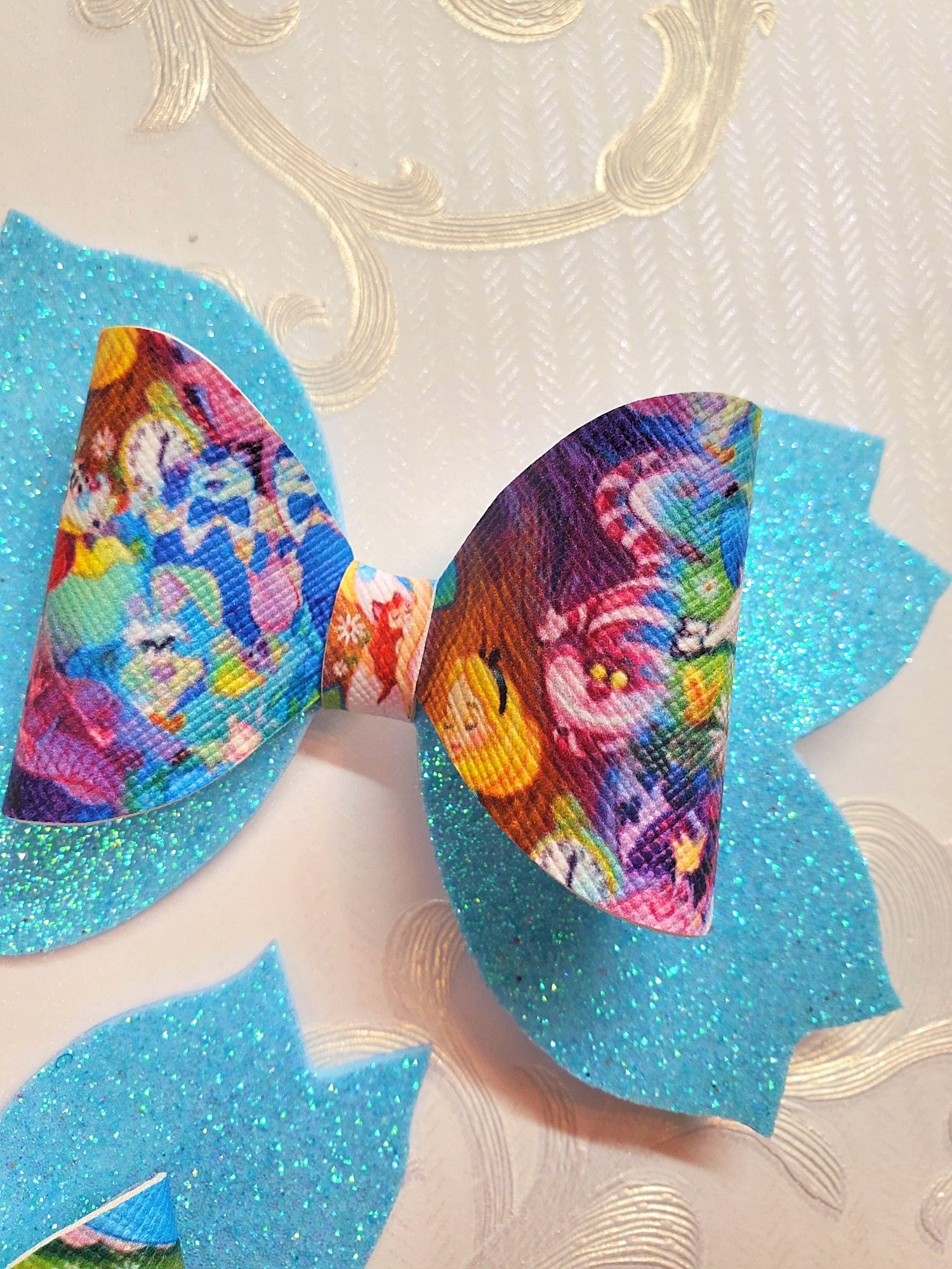 🎀 Details: *Handmade with high-quality faux leather and glitter fabric *Wonderland character print overlay *Measures approx. 5 inches wide *Attached to an alligator clip or hair tie (customizable) *Great gift for birthdays, cosplay, or themed parties